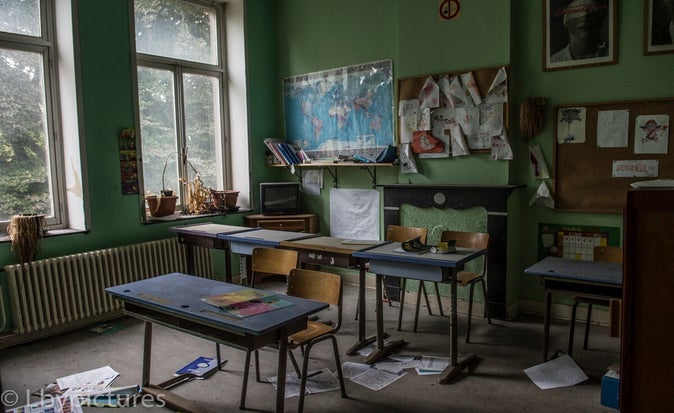 Binnen is het echt supertof om te zien hoe leerlingen hier vroeger les kregen, en de turquoise details geven het geheel een bijzondere, bijna magische sfeer. Zo’n plek laat je even terug in de tijd stappen en zorgt voor een unieke urbex-ervaring.